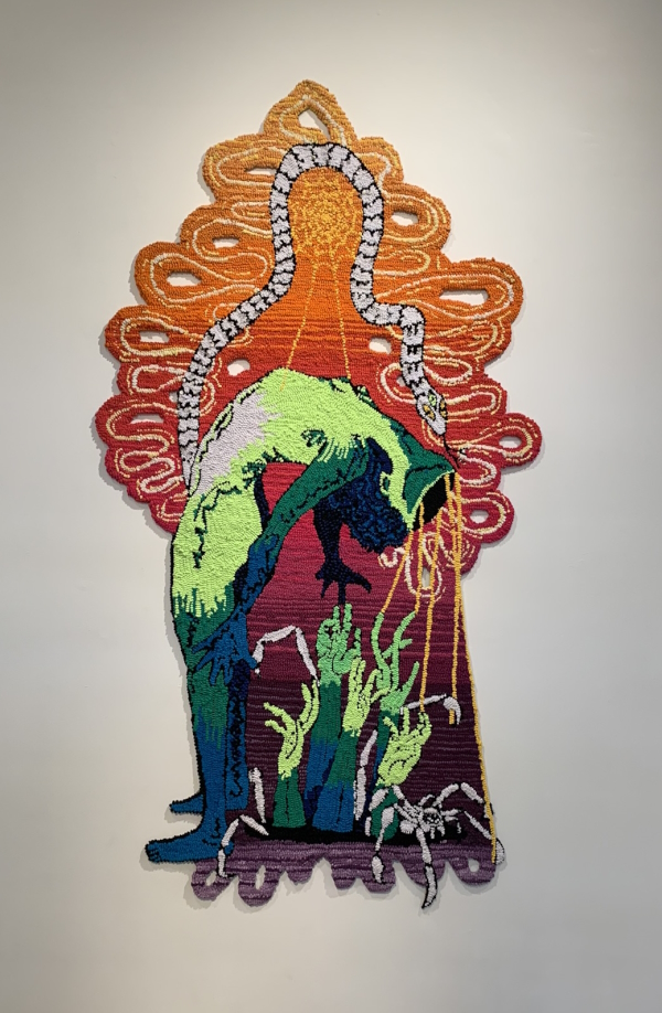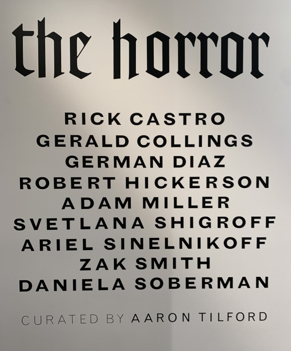 I had been scrolling through Instagram the day before we left (like you do when you are supposed to be listening to someone talk about teaching vocabulary) and saw an artist whose work I love post that her stuff was in a show in LA…hey, I’m going to LA…I could stop by if it’s close. It was close to the other gallery, and on the way back to the museum in Torrance, so we headed for a small gallery, the Seis Gallery. The show was called The Horror…