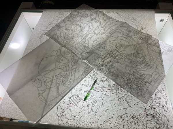 I think I have most of the figures on the left done. I’m trying to refrain from more details. There’s enough. I got myself all tied in knots over shadows last night…drawn shadows. They just got to be too much. So I got rid of a bunch of them.