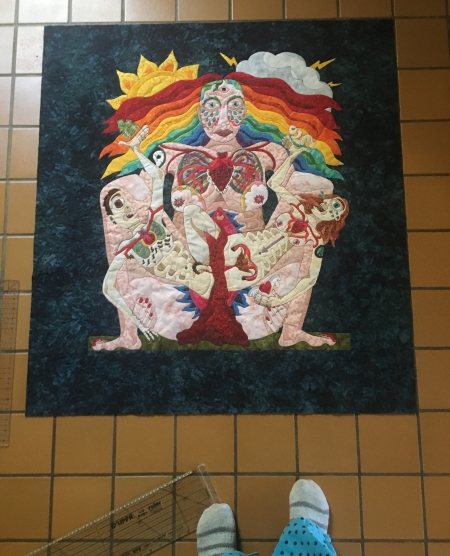 Well I finished the quilt. On time. It’s at the photographer. I’ll enter the show tomorrow, before I leave…well before the deadline. Mostly because the deadline is while I’m gone. It’s weird, though…I’ve been head down, finishing stuff, for months now…and now I don’t know what I’m doing next. There’s some deadlines, but I think they’re all in June. So yes, I need to work on them, but I need to draw some stuff and decide priorities first. I have other quilts I could start, drawings that are already numbered and ready to go, but I need to spend some time staring at deadlines before I make that decision.