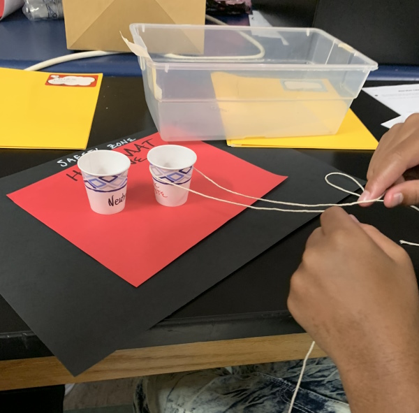The lab was about teamwork (always), so they had to dump one cup of M&Ms (toxic waste) into another empty cup (neutralizer) without touching the cups with their hands, and without putting their hands in or above the red haz-waste zone.