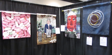 The circles seem to lead the eye from the left piece to the right. It’s always interesting to see it hung in real life, instead of just laid out on paper. It was harder to visualize the works together in the space than I thought it would be…I would think it would be easier if I had them in the space and could choose the hanging order. That said, it is a beautiful show, thanks to all the hard work of the artists and Sue Reno’s decisions on which pieces to include. I’m looking forward to seeing the catalog, which is in process. I’ll announce its availability when I know it’s coming out. I appreciate SAQA for giving me the opportunity through the curator-in-training program to put this exhibit together; Kathleen McCabe, Martha Sielman, Eileen Doughty, Lisa Ellis, and Bill Reker for their help within SAQA with the process, the website, the shipping, and the entry program; Mary Claire Moyer and the Mancuso Brothers for helping SAQA and me, and giving us the exhibition space; and Sue Reno and the artists for working with me to create a great exhibit. The feedback we’ve gotten has been positive, which is a plus.