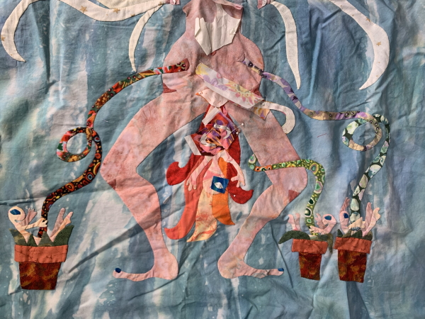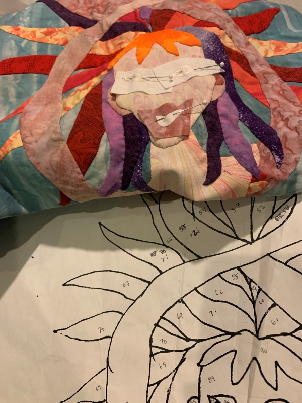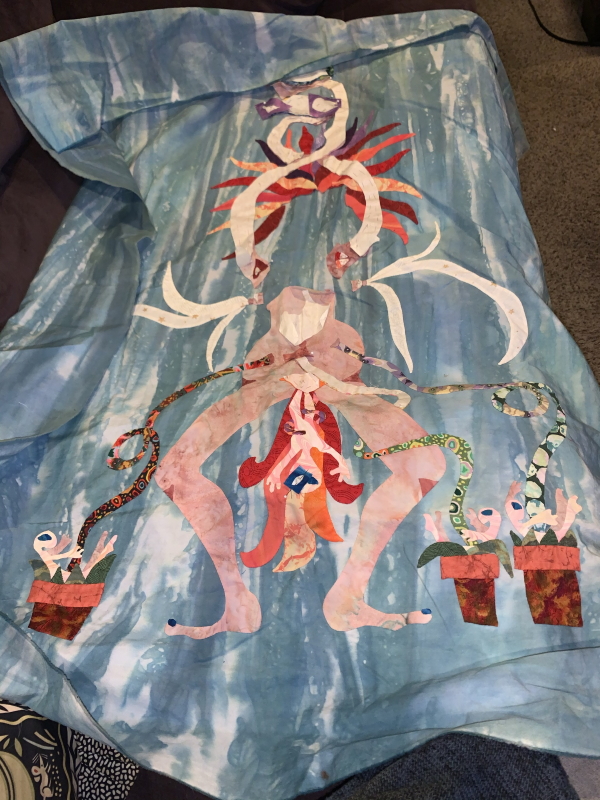 So meanwhile, I have one piece on a deadline here, so it makes sense that I worked on anything BUT that piece. I finished the quilting on this 20-year-old piece last week, and Saturday, I put a binding on her.