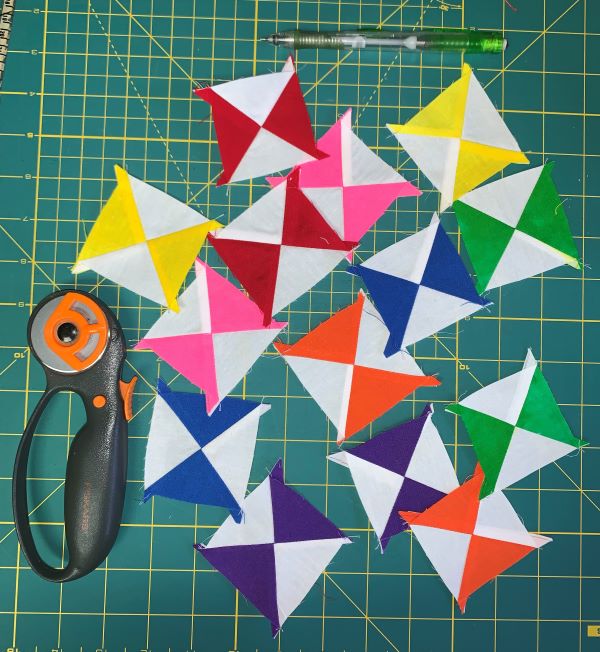 Which ALSO wouldn’t take long, but I’m trying to be good and work on the one with a deadline. I was supposed to be in Los Angeles for 2 1/2 days this week, but my niece is coming down this week instead of next week, so we juggled our flexible plans into LA next week….thus juggling my art plans as well…I can’t do certain parts of my art process on the road. Odds are, I won’t be working on the next quilt on the road no matter what, but I’m using that trip to motivate me to iron. Why is ironing an issue? This quilt has a lot of small pieces and it’s sometimes tedious to iron tiny pieces (you’d think I’d learn), but also ironing is hot and the light in here is hot and it’s not THAT hot here (no heat dome…yet), but my hot flashes plus fairly reasonable summer temperatures just add up to ugh. That said, here’s an hour or so of ironing done…