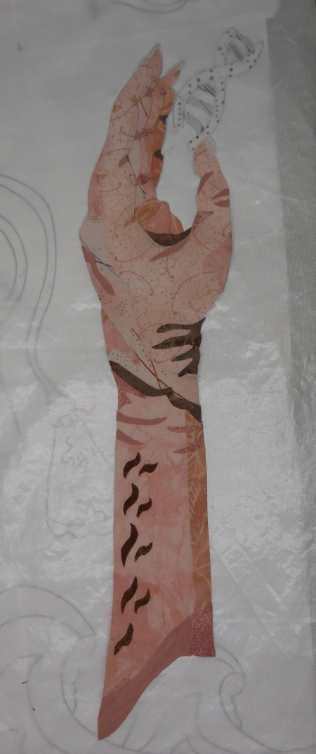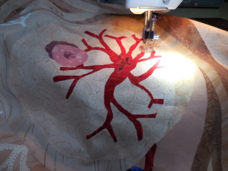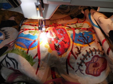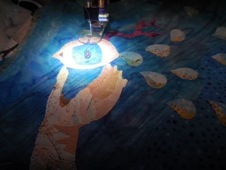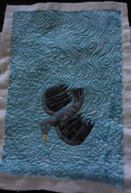 I spent some more creative energies on quilting 6 because the quilting shows better on the lighter backgrounds. Plus it’s in the air, flying, so I wanted to emphasize the movement of the wings affecting the space around it.