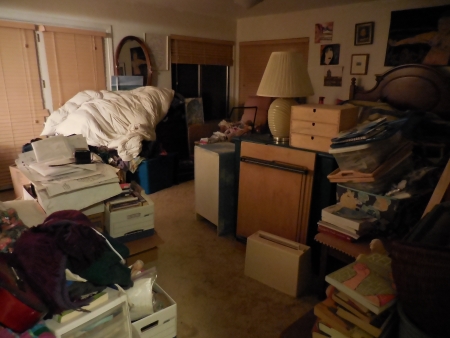 whereas I’m sitting there with that one tiny bookshelf, trying to decide whether I need all these books, finding one acrylic painting book from my dead great-aunt where she had obviously torn out half the pages in the book (huh?) and it was mostly useless. We worship books in my family. It’s very hard to trash anything, let alone get rid of it, especially if it seems to have some historical significance. So in my section, everything is piled up on the floor as I try to decide what to do with everything.