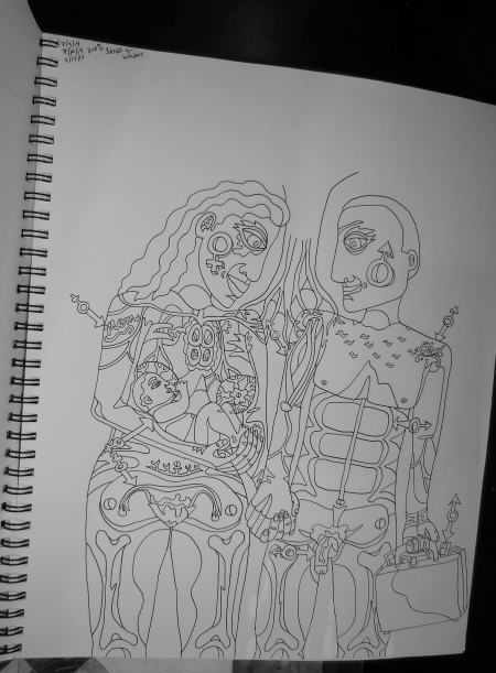 I’m trying to leave space at the top for the tree. But they need feet too. Or do they? Have not decided what happening at the bottom. Actually. Wait. I lie. I have decided. Just now. Huh. The brain works well sometimes, at least on things of significance, like finishing drawings. Cuz that’s gonna save my world.