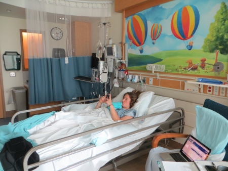 in the Acute Care Pavilion of Children’s Hospital, the big glass building in the background. I wish I could say I wandered around and took lots of pictures of all the art that was there, but mostly I stayed in the room with her, barely able to concentrate on anything longer than a blogpost. There was some possibility after this morning that I would have to spend a third night, so midday, I went home and showered and packed another bag for tonight, thus guaranteeing that I wouldn’t have to spend the night, right? Oh well…it was better to plan for it than not, like the night before. I think I’ve been home a total of 4.5 hours in the last 50.