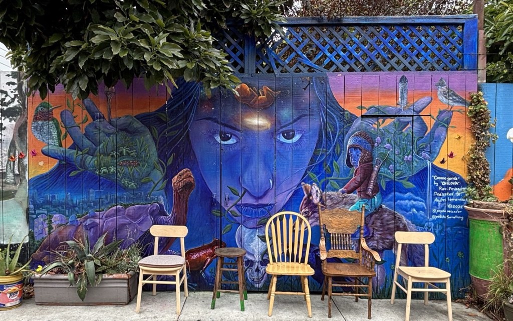 I kind of like the chairs here, but it blocks the painting a bit. This is Cosmogonia by Chilovia, Raiz-Peskador. I see two Instagram accounts on the painting: Pancho Pescador and Pablito Something.