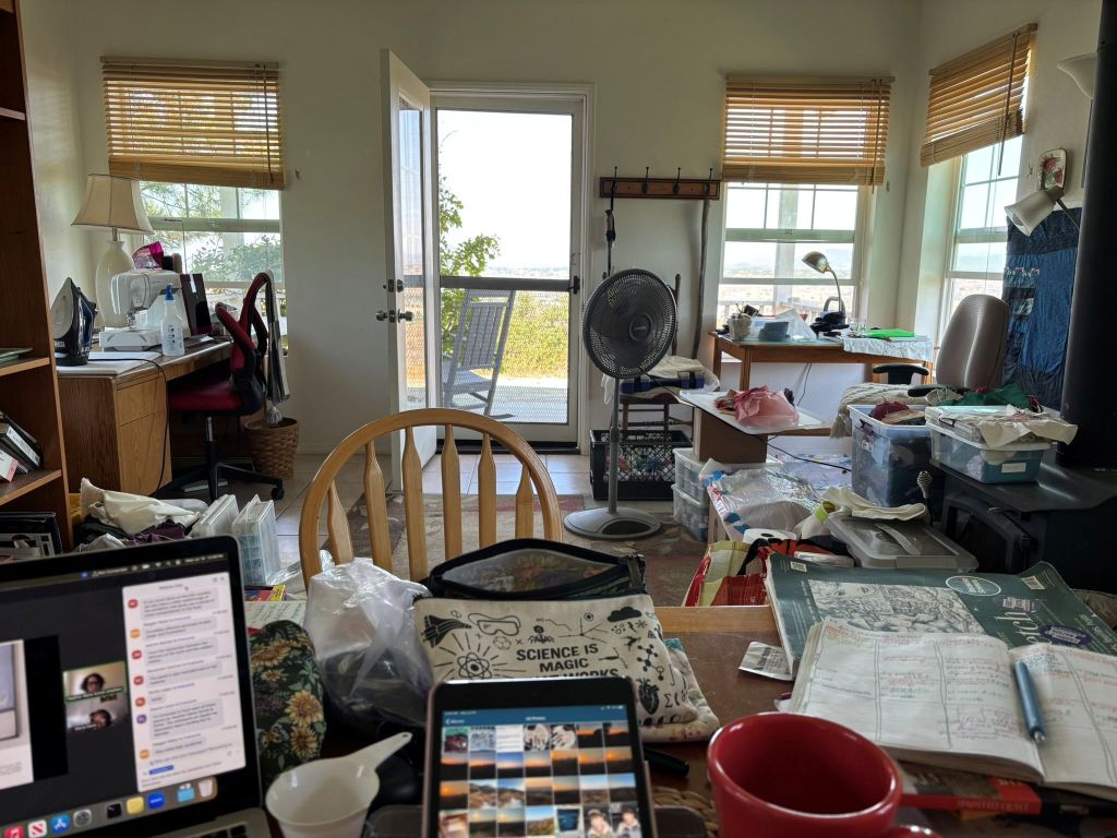Here was the indoor space when I had multiple projects going. I was in a Zoom or webinar, one project on the porch, a pile of stuff under the table, sewing machine to the left, the beginnings of the woman on the right. It was chaos.