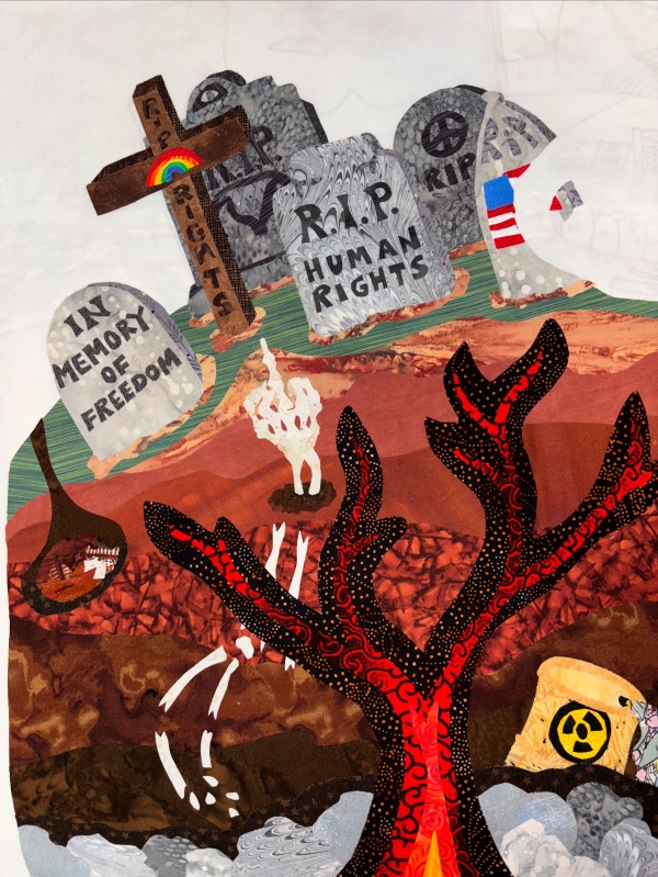 The upper portion with all the puppeteers of evil is amazing. There are strings coming down from their hands to try to control everything.
