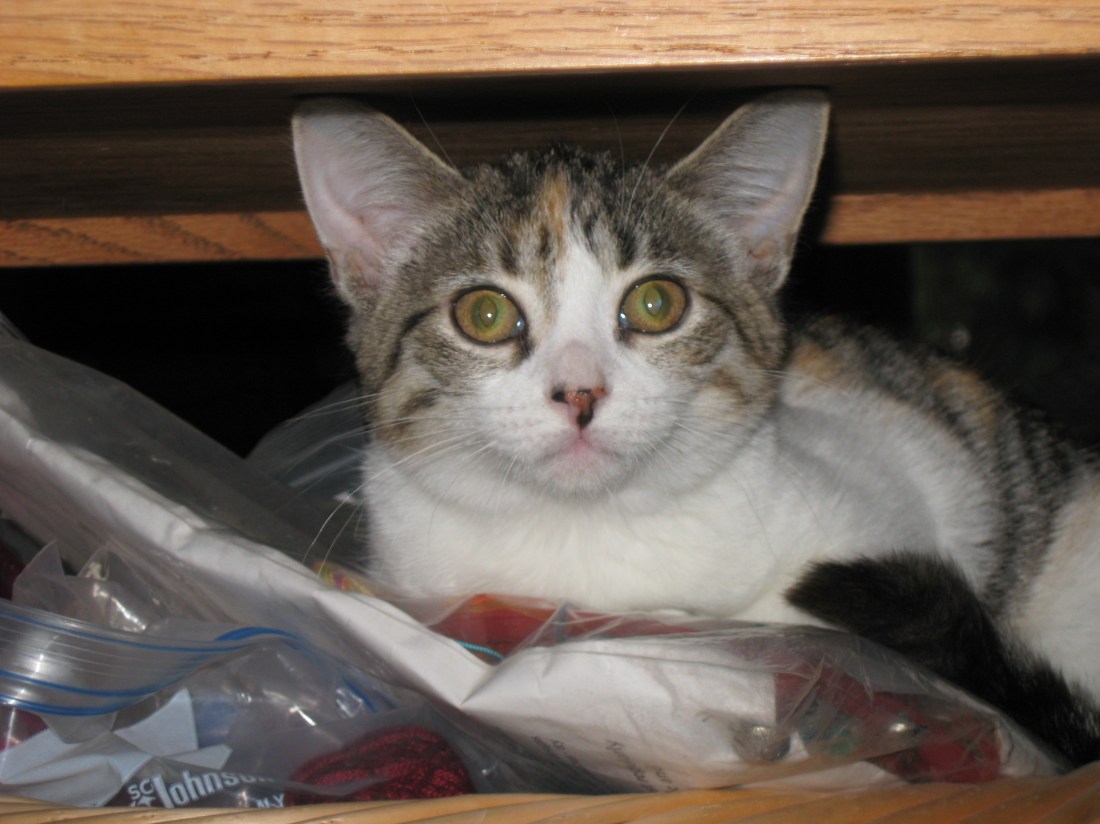 We had two cats and two dogs at the time, so it’s not like we needed more, but the other two were getting older, so? Her original name was Holly, because we had mostly been naming animals after plants (of course, the current cats were Midnight…named by girlchild…and Limbo…who was supposed to be adopted out, but I was pregnant with the boychild and well, it was a baby). But she never answered to it and it never really fit.