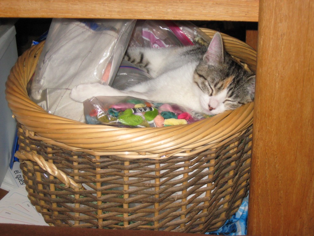 Bowie doesn’t leave her alone, so I moved her food and litter tray into here, the smallest room in the house (besides the bathrooms), where I have the most shit, but I can close the door against the teenager who wants to bug her. I can’t get to a chunk of my fabric at the moment unless I move that really old chair with her on it. Sigh. It’s fine. I’m working around her. She’s peacefully sleeping most of the time.