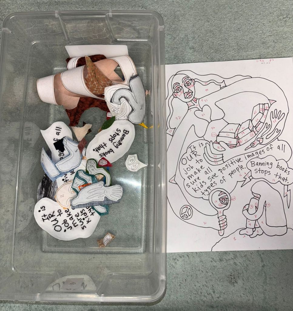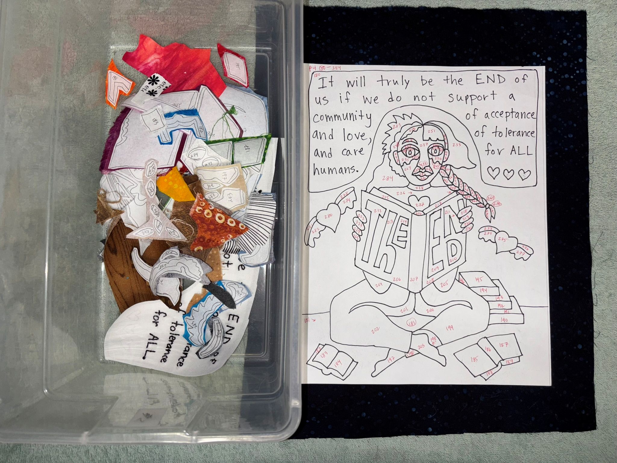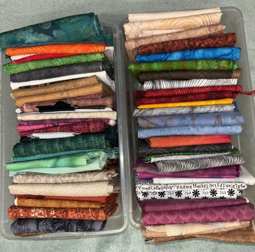 I almost finished…just need to do the pile of books in her arm. Then I’ll keep cutting stuff out tonight, tomorrow night, and Sunday, and then hopefully be ironing it all together by Monday. That’s the plan. The deadline on this is tight. I’m running out of time. It’s a good thing grades are done. Here’s all the fabrics used so far…