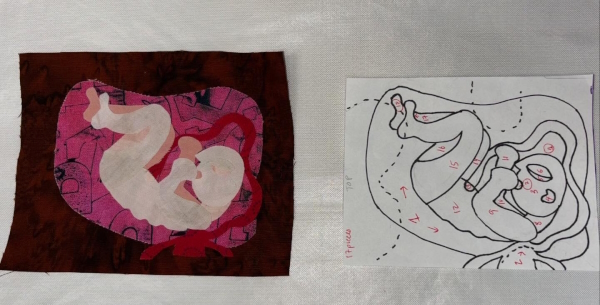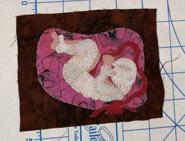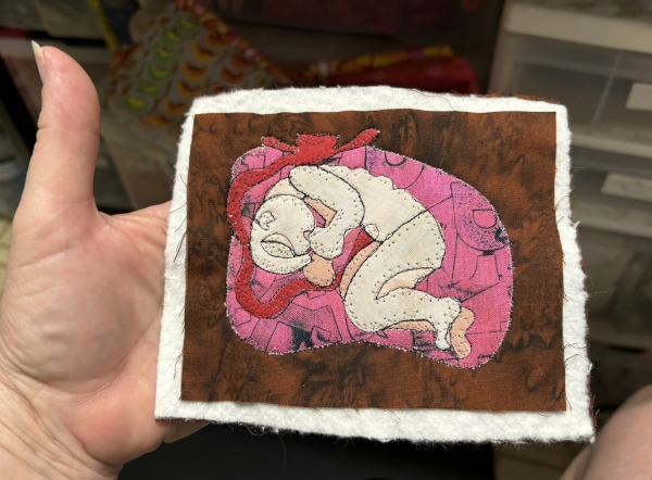 I did two of each bug: one normal bug colors (for that bug) and one NOT normal…tending toward rainbows. I also trimmed the Wonder Under for the last bug. I had bugs in different stages of the project so people could see what it looked like in the demo. So now I have four ready for stitchdown, and hopefully the fifth tonight.