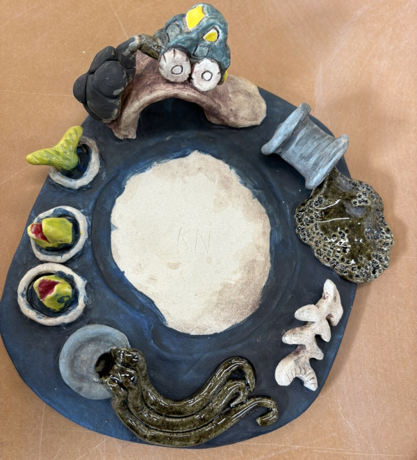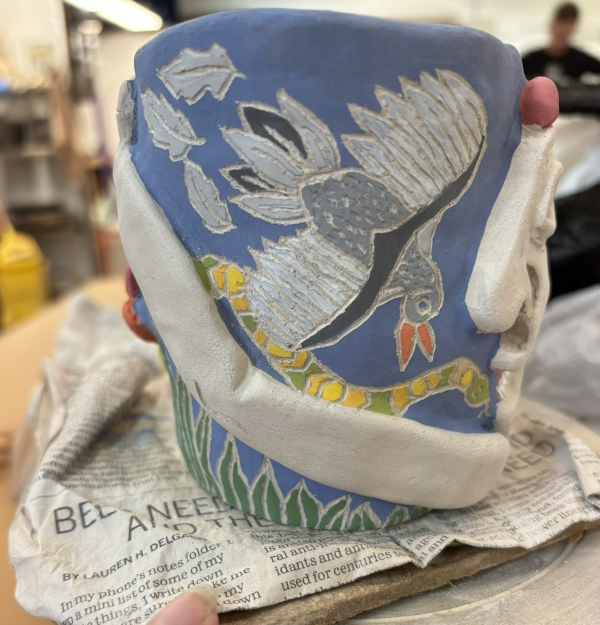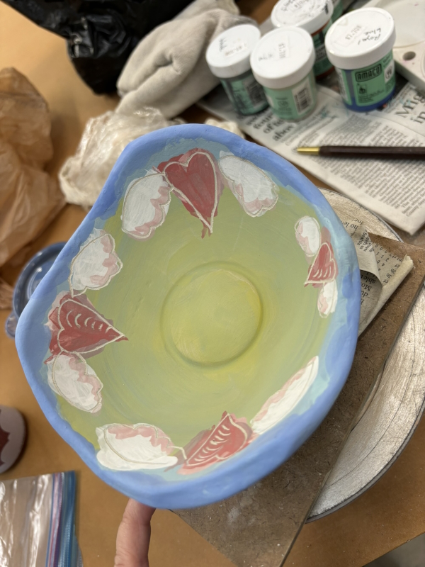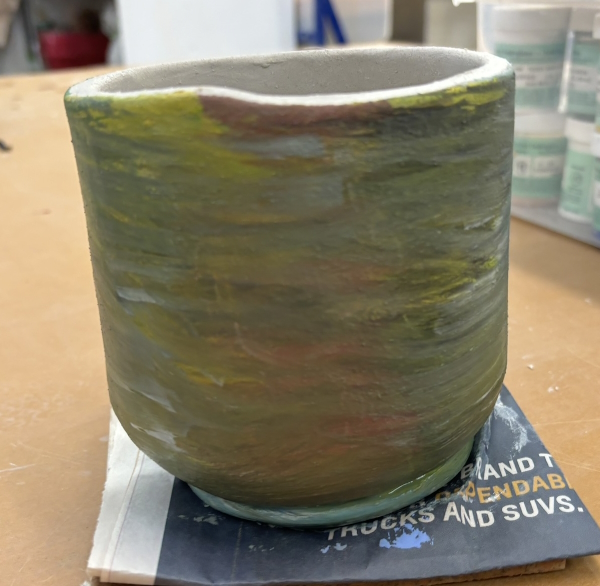 I also went to ceramics on Monday. I had this thing that was supposed to be another mug (ha!), but was way too big (I will never learn), so now it will be a planter. I had painted it with all the leftover underglazes and started carving it.