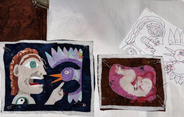 Meanwhile, my art here is all bugs, all the time. I have things in my head, but I need to get the bugs done by next weekend for delivery. And sanity. So I got two sewn down to the canvases on Monday night…