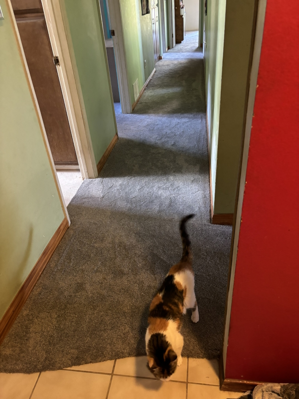 There’s her half-toothless face. I try to bribe her with treats. She must be eating something, though, because she’s not super skinny at the moment. It’s warm and she doesn’t like that. I worry about her lots. Leaving her for 5 days…ugh. She won’t take her meds if I’m not here. But she’s fighting taking them now. So there’s that.