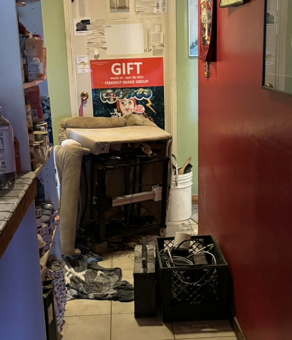 Usually with a piece this big, I’ll iron it down on the entryway floor so I can see and place the whole thing. There were two major pieces and then a lot of smaller things. But the entryway floor is a fucking disaster (see closet discussion above), so it wasn’t an option. So the pro is I did it on the ironing board. The con is that it’s not straight on the bottom, but I’ll fix that when I sandwich and pinbaste it. Here’s the whole thing, late at night, in the dark…