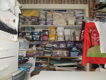 Then under the sewing machine desk are two drawers of brown, two of pink/flesh, and then a ton of flesh colors that won’t fit in there. The top pink drawer is broken…the plastic is so old and one of the fatter cats kept sleeping on it until she broke it. I keep meaning to try to replace it. I’ve been really good over the last two years about not buying backing fabric, about using up what I have.