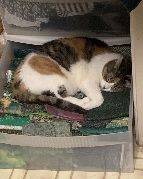 Kitten is continuing in the tradition of all cats in here by depositing her fur in this, the most hairy of all the drawers, the big green drawer. It’s not the only green drawer, but it is the biggest.