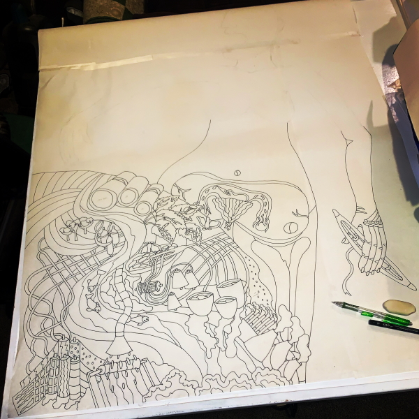 Meanwhile, the art is back. I almost walked away from this drawing the other day. It wasn’t really talking to me, and I’d dealt with a host of show rejections and wasn’t feeling it. I left it for the 6 days we were gone, just to see. But coming back, I wanted to just make my own thing, fuck the rest of it. But then I gave it one more chance and it started talking to me, so I kept going.