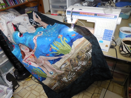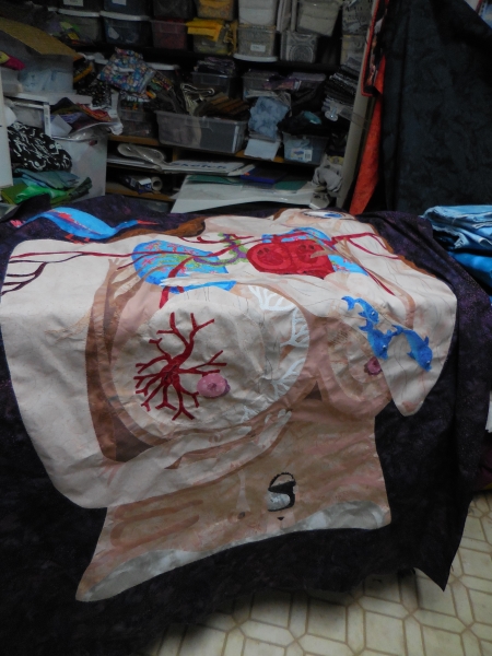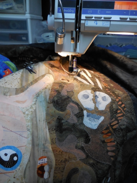This camera…those are all much darker than they are here. The two pieces on the left are vying for the position of background of the next quilt, which I will be starting soon. Hopefully I’ll get the binding machine-sewn on tonight, and then I can do hand-sewing whenever, and start tracing the next one…because it needs to be done in…four weeks, max. I can do that. Maybe. I certainly don’t have school in the way.