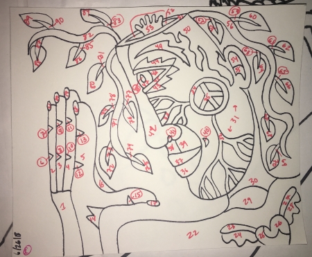 So after I went and got my annual eye exam, came back and did a sample edit and wrote a bid, and ate dinner and only embellished 2 balls instead of 3…then I numbered the two drawings. Mind you, these are only 5×6″. This one had 90 pieces and the other had 39. Still not small or easy. But they jumped the line because they’re due the end of July…