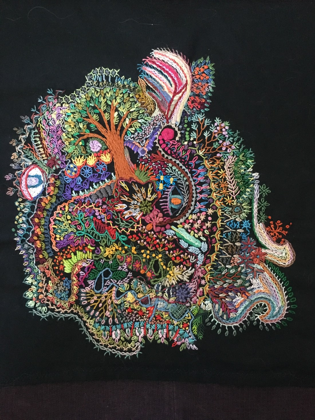 The white lazy daisies up on the top right plus the fern stitch. I also sewed 4 eyeballs down, but that’s not documented photographically. Just imagine the elephants from a couple days ago, but with no pins through their eyes.