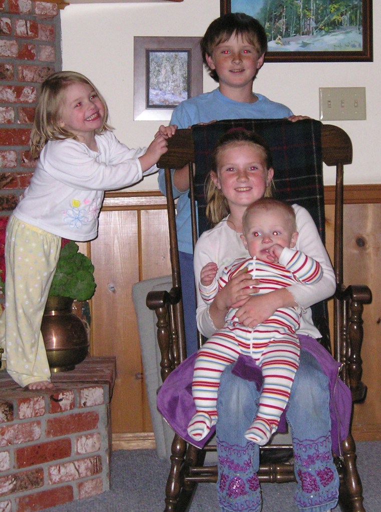 OK. School meeting with team. School meeting with coteacher. School meeting with literacy team. School school school. We know how all that goes. Simba is not thrilled about his week at all…no boychild, nobody. Oh yeah! And it’s the girlchild’s birthday. She’s ancient. OK, not really. But here’s where I find an old picture of her when she was an adorable (loud, door-banging, delightful) child. WAIT! Even better…oh look at all those red eyes. The boychild behind the chair, girlchild on the chair, holding the nephew that just graduated high school and is going to COLLEGE, and the niece on the left who is just starting her senior year in college.