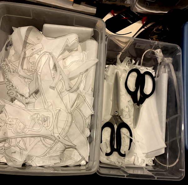 But now I can go back to the other one, which has a later due date…first I have to deal with this pile. Mostly it’s the fabrics I used for the last two quilts. I keep them out until I’m done in case I need to recut something, which happens at the ironing down stage usually.