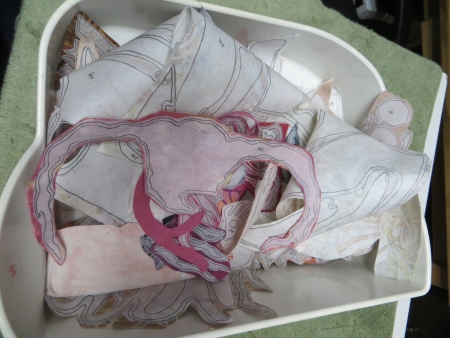 I’m through the 400s…into the 500s. I could have started ironing the 500s, but didn’t feel like starting it. Depressing subject matter. Couldn’t look at it. Need some distance from it. Maybe tomorrow night. I just ironed all the leftover bits from the body…the heart and the nipples and the eyeballs and the hair and the eye she’s holding onto, or is she trying to catch it? Who knows.
