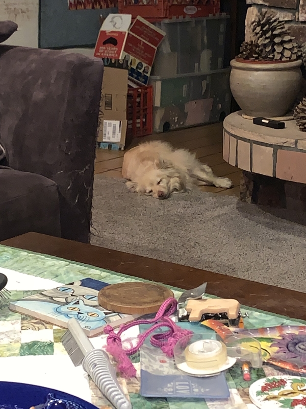 I didn’t do anything after that except be tired. I did stitch on some dots…this was Friday night’s…the one under the green spool.