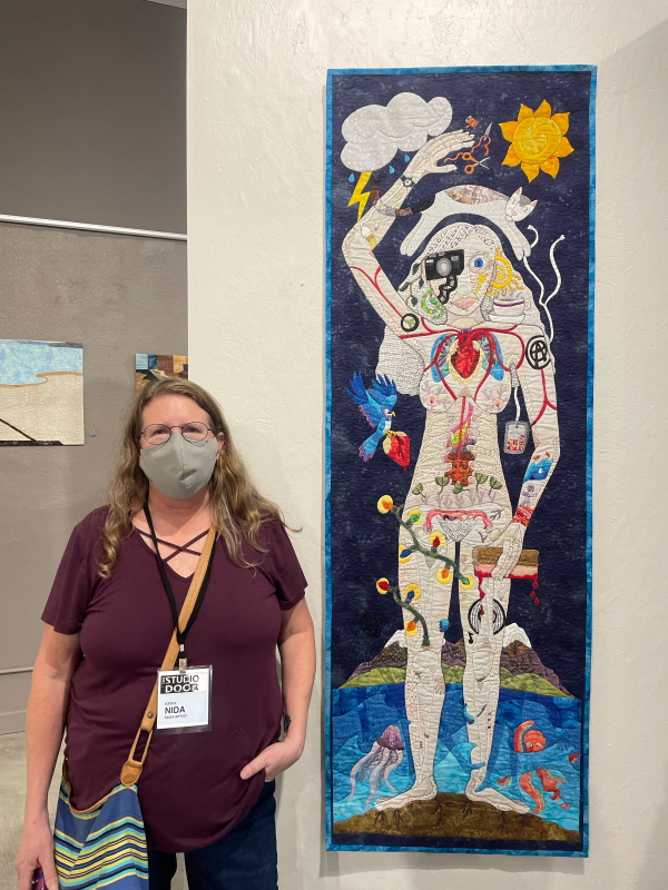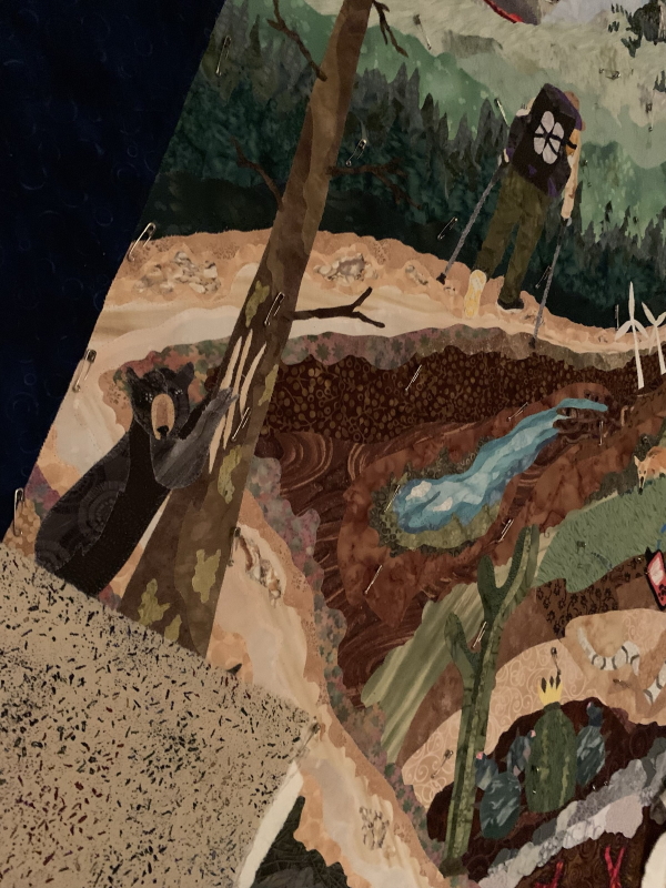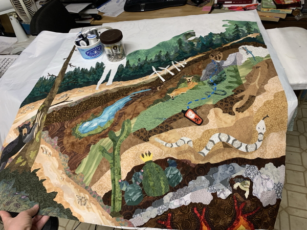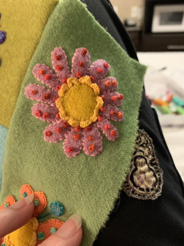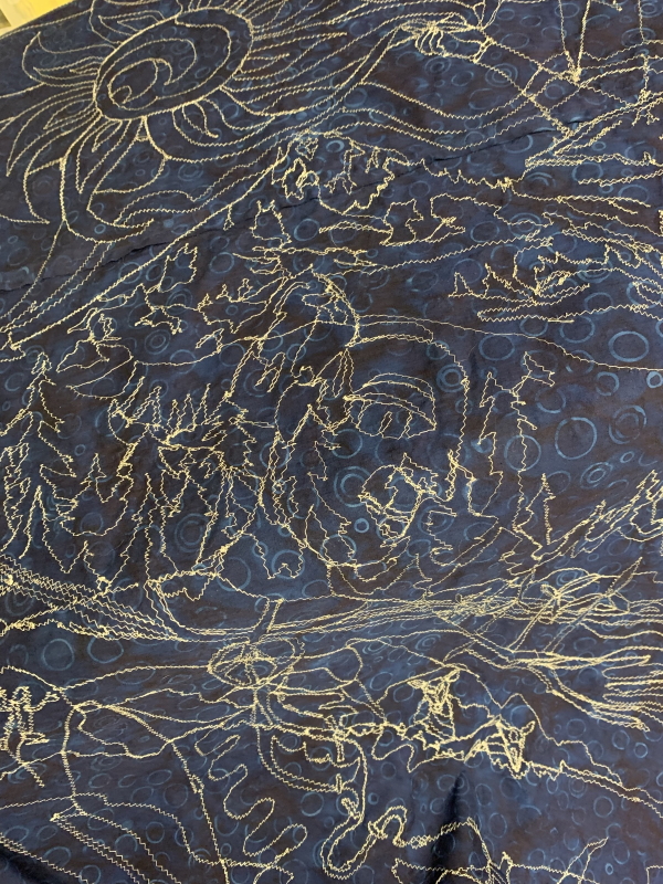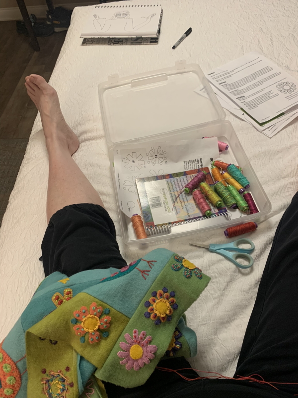 I appreciated meeting with friends last night…when I was dropping the Man off on the PCT, I had almost finished a Sue Spargo quilt I’ve been working on since 2020. I think I’ve been doing the borders for a year (they are complicated and I don’t work on them regularly). I had about 2 3/4 of the last stitch on the last 4 flowers to do, and I could have done it in the car on the way up to Kennedy Meadows, but then mentally I couldn’t. So it’s been sitting around. I was fairly sure last night would be the big finish, which is kinda cool, since they’ve been around (mostly on Zoom for the whole damn thing). And here we are!