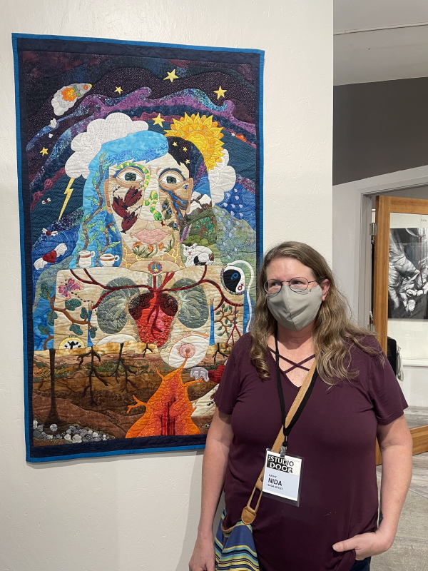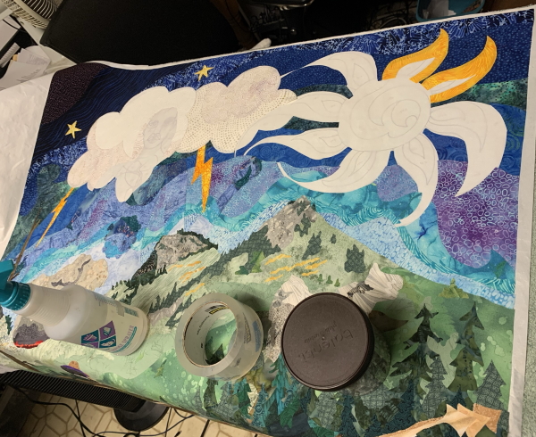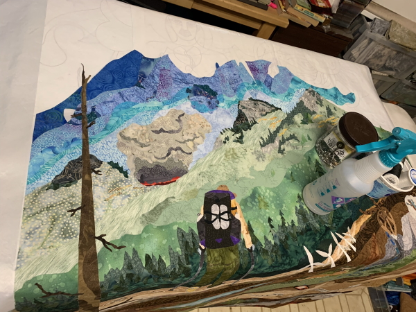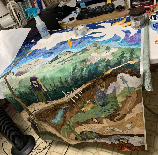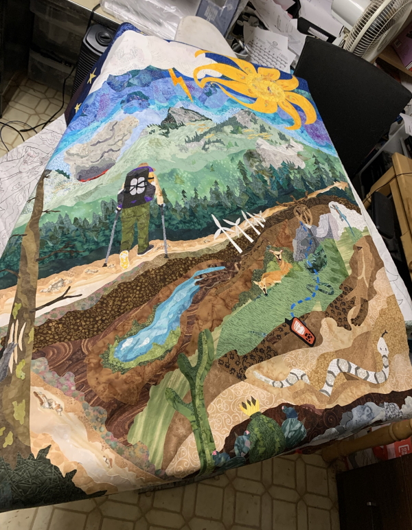 I appreciated meeting with friends last night…when I was dropping the Man off on the PCT, I had almost finished a Sue Spargo quilt I’ve been working on since 2020. I think I’ve been doing the borders for a year (they are complicated and I don’t work on them regularly). I had about 2 3/4 of the last stitch on the last 4 flowers to do, and I could have done it in the car on the way up to Kennedy Meadows, but then mentally I couldn’t. So it’s been sitting around. I was fairly sure last night would be the big finish, which is kinda cool, since they’ve been around (mostly on Zoom for the whole damn thing). And here we are!