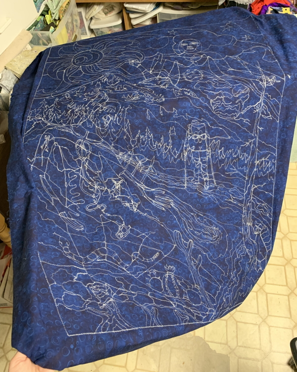All the embroidery is done; I just need to sandwich, quilt, and bind. Minor work…compared to the rest of it. It’s nice to have a finish. My quilt guild is doing the UFO thing again…so I made a list of the unfinished and it was long. I will need to pick a couple to do though. This will probably be one of them.