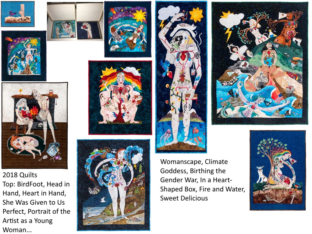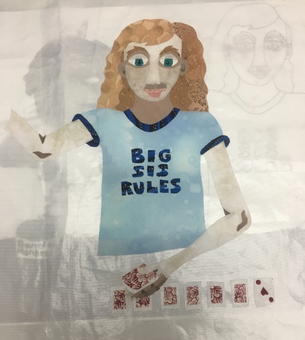 And then I decided how to add to it. I had been told to use fabric if I wanted to, because at the beginning, I was saying, hey, I don’t paint, and that was OK. So I sewed right onto that canvas, and then added some stuff above and below, plus some squares for the inmate to add to…