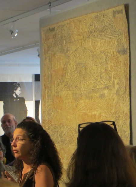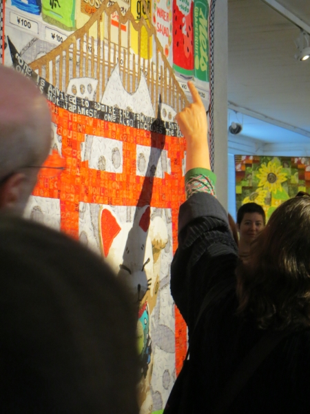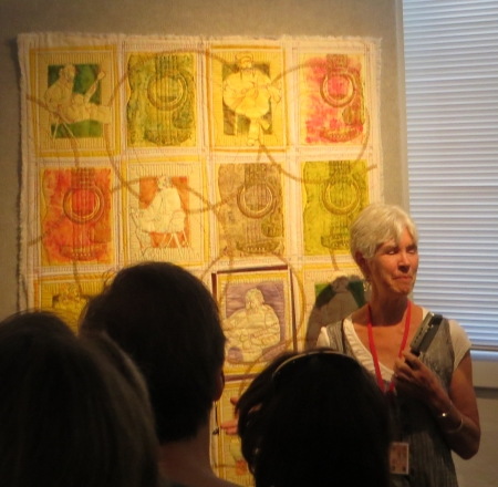 This is a full picture of Laura Fogg’s Jammin’, which I described in the last post on the artists’ talks. You can see the circles that I think of as coffee cup marks even now that I can see the echo of the center of the guitars in her stitching.