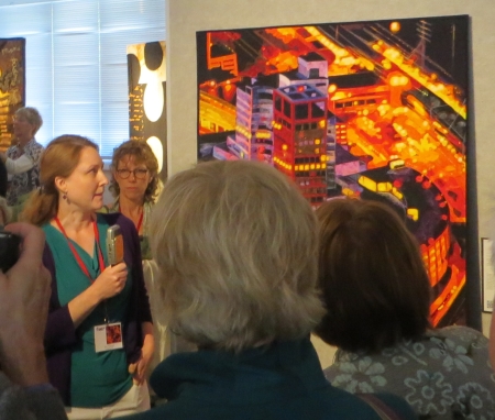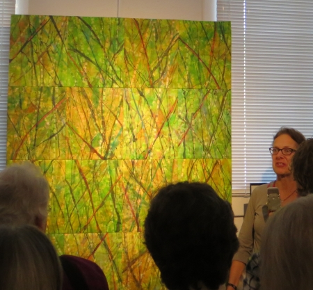 In this photo, most of Susan V. Polansky’s piece No One But You is visible on the left, and now you can see all of Robin Schwalb’s Jive Boss Sweat, then the left side of Barbara Schneider’s Forest Floor, var. 2. Polansky said that her quilt was about being lost in the moment. She said it took 3 years to make the quilt, that she had so many distractions going on, but that celebrating the moment was part of what the quilt was about.