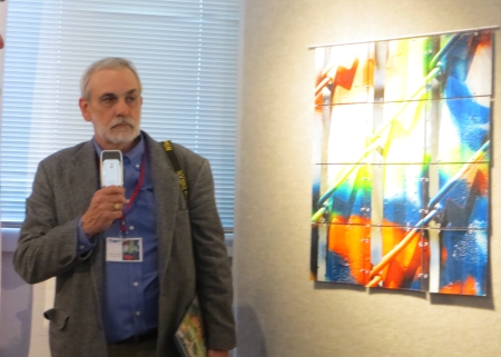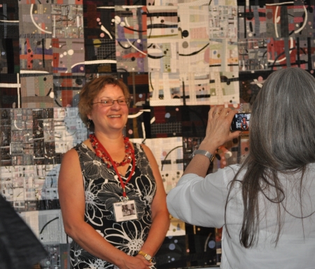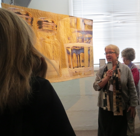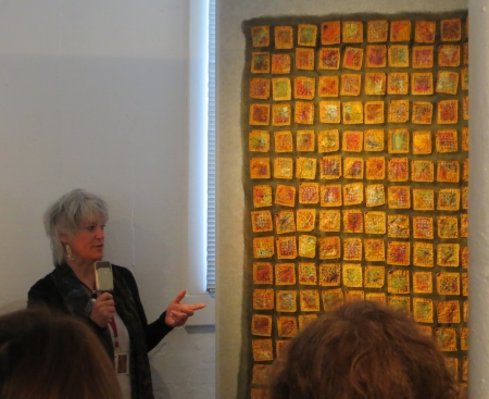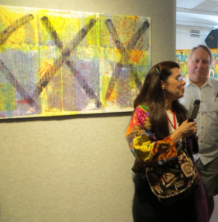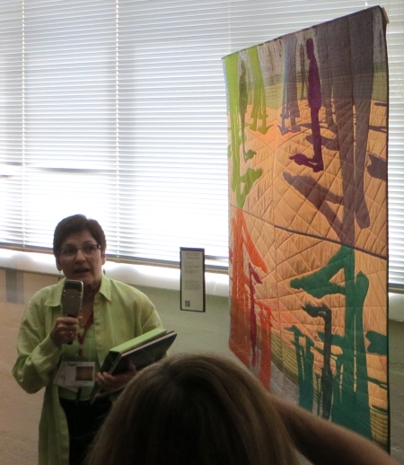 I think that’s Denise Linet’s Letters to Myself–Page 4 on the far left, with Linda Colsh’s Defiant in the far back. Colsh was one of the jurors, and she talked about calligraphic marks and big strokes, which are apparent in her piece. Beatrice Lanter’s Blossoms is in the foreground. Behind it to the right are Karen Tunnell’s Bubbles and Carol Watkins‘ Vintage. Peggy Brown’s Soliloquy II peaks out on the right. Brown talked about fusing paper onto fabric, then painting over it.