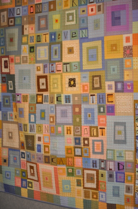 Molly Allen’s No One Knows Not Even Poets How Much the Human Heart Can Hold –Zelda Fitzgerald is a different piece. The title is included, pieced into the quilt.