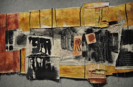 This is Sidnee Snell’s Riveting about the bridge she is apparently obsessed with. A friend and I compared Snell’s piece to another photo-derived piece…hers glows with depth and light that can only be achieved by multiple layers of cloth and stitching.