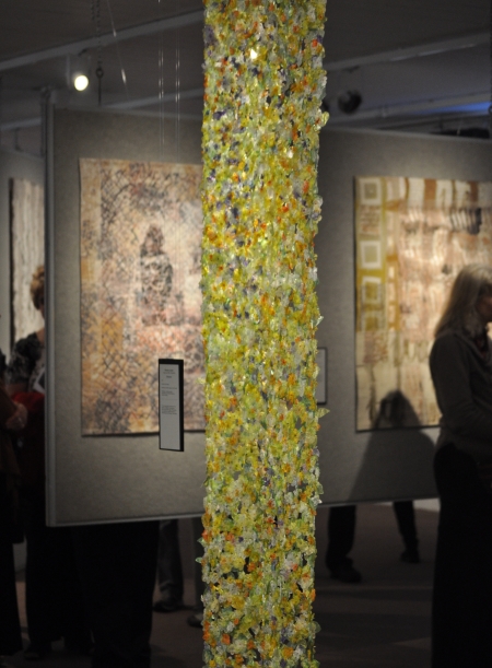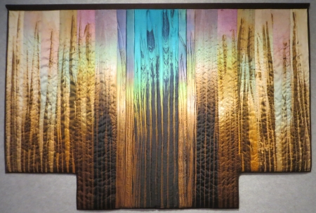 Miriam Nathan-Roberts’ Salt & Pepper did start out as a photograph, but she wrote in the catalog about how important it is to her that she significantly alters the digital image with her hand, her stitching. She did well with portraying so many layers of glass and shiny metal in fabric, always a difficult prospect.