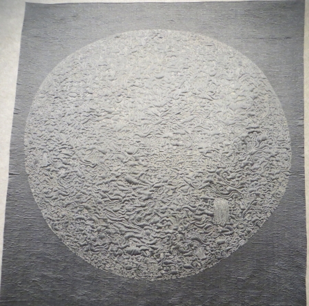 Brienne Elisabeth Brown’s Moonset is another very subtle piece from a distance. She says she is fascinated by moods and monsters, so when her husband interrupts her detailed stitching time, sometimes she sews his details into one of the monsters in her moon. She sews very slowly, which I think is the only way to put those creatures in her quilts. I have a detail coming up in a future post.