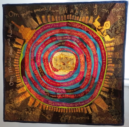 This is Bonnie Peterson’s Kora (Pilgrimage). She talked about a trip to Beijing the year before the Olympics and issues with the Chinese government and Tibet. She used monks’ sayings and Tibetan prayer wheels in her piece to represent treaties between China and Tibet. The piece refers to some of the Tibetan rituals.