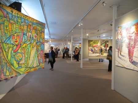 Here are some general views of the space, which was large and open. In this photo, you can see the right side of Robin Schwalb’s Jive Boss Sweat, then the right side of Barbara Schneider’s Forest Floor, var. 2. To the right is Susan Brook’s Together and Sandy Gregg’s Listen to the Rhythm of the Falling Rain. Way in the back, you can just see Katherine Knauer’s Solar City. In the forefront is Kate Sturman Gorman’s Bernadette in Artichokes, with Dinah Sargeant’s Old Child and Paula Kovarik’s Round and Round It Goes barely visible to the right.