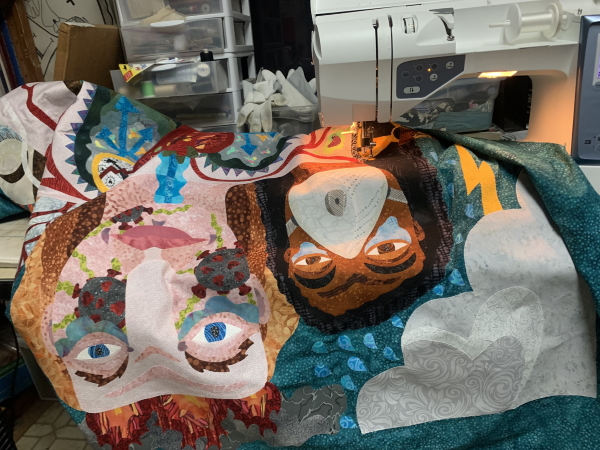 So meanwhile, I have one piece on a deadline here, so it makes sense that I worked on anything BUT that piece. I finished the quilting on this 20-year-old piece last week, and Saturday, I put a binding on her.