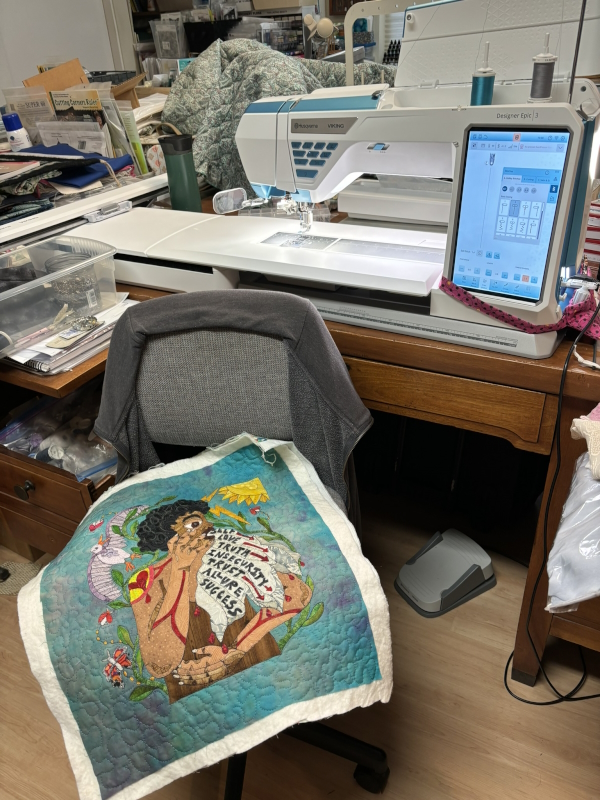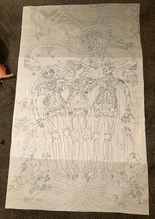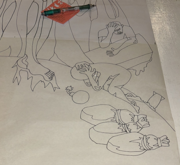 Meanwhile, parts of the drawing were slowing me down…the one side on the left, for reproductive rights, and the bottom, under the women’s feet. I did add body bags to the right.