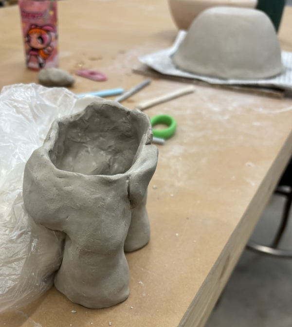 OK, my art brain finally kicked in a little stronger. Not sure why? But I appreciate. Monday after school, I went to the ceramics studio and made a base and the start of the next piece. I really wish I had my sewing machine so I could start the fabric bits of the ceramics that are done, and I wish I had the brain power to figure out how to glaze the bisqued piece (too many decisions), but for now, I just wanted to start something new. I had an idea and there was a bowl in the studio to help me out, so now I have this…