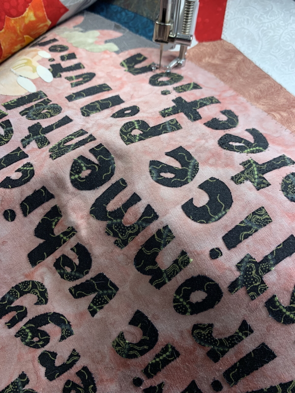 Then came home and focused on cleaning up the art space, putting fabric away, even cleaned the floor because there was something on it that made it very slippery in one area (don’t wanna know what) and I was afraid I’d fall and break something. Like my leg. That would make life fun right now, right? Oh wait! Before I cleaned up in there, I had to deal with this. So we have this older friend who isn’t a quilter, but she had these blocks she cross stitched, and then I sandwiched them for her and she quilted them (the white threads are all my basting threads)…