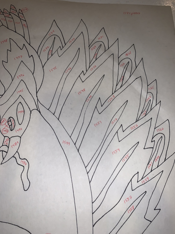 I have been ironing every night, despite the chaos. I will not give up on making art because my day job is untenable, unsustainable, unbearable. In the last two nights, I’ve gotten through about 200 pieces, ironing a pigoon (Margaret Atwood, Oryx and Crake) and all its requisite stuff, including goggles (if you were a pigoon, you’d want goggles too. Don’t lie). And an ‘easy’ button. One hundred years in the future, they won’t know what an ‘easy’ button is. I’m OK with that. I’m in the 1100s. And almost 22 hours of ironing. If you’re wondering. I started on January 30th. Not a fast process. Even with 3-day weekends that are sucked up by the day job.